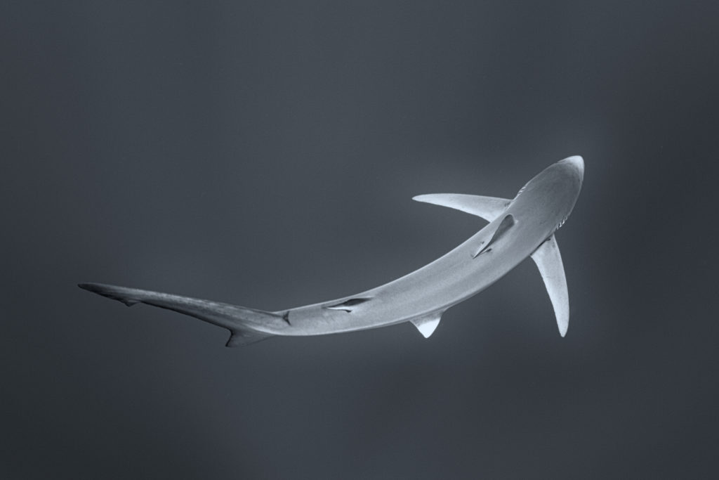 Die Flossen des Blauhais sind besonders charakteristisch. Die langen, spitzen Brustflossen tragen zur Stabilität und Manövrierfähigkeit des Hais bei und sind besonders auffällig. Die Rückenflosse ist relativ klein und weit hinten am Körper positioniert, was dem Blauhai ein einzigartiges Profil verleiht.